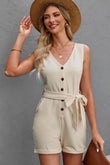 Button Front Belted Sleeveless Romper