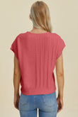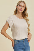 Double Take Full Size Cable-Knit Round Neck Short Sleeve Sweater