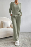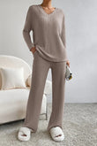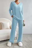 Elevate your loungewear with our Ribbed V-Neck Top and Pants Set. Made with high-quality ribbed fabric, this set offers both comfort and style. The v-neck top adds a touch of sophistication, while the ribbed texture adds depth and luxury. Perfect for relaxing at home or running errands in style.